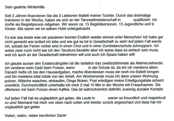 In der SRF-Sendung «Reisen ist nicht für alle möglich» vom 13. August 2025 geben Personen darüber Auskunft, die nicht in die Ferien fahren (können). Darunter auch die alleinerziehende Mutter Maria, welche von der Winterhilfe Zoo-Gutscheine erhalten hat uns sich so mit ihrem Sohn einen schönen Tag machen onnte.